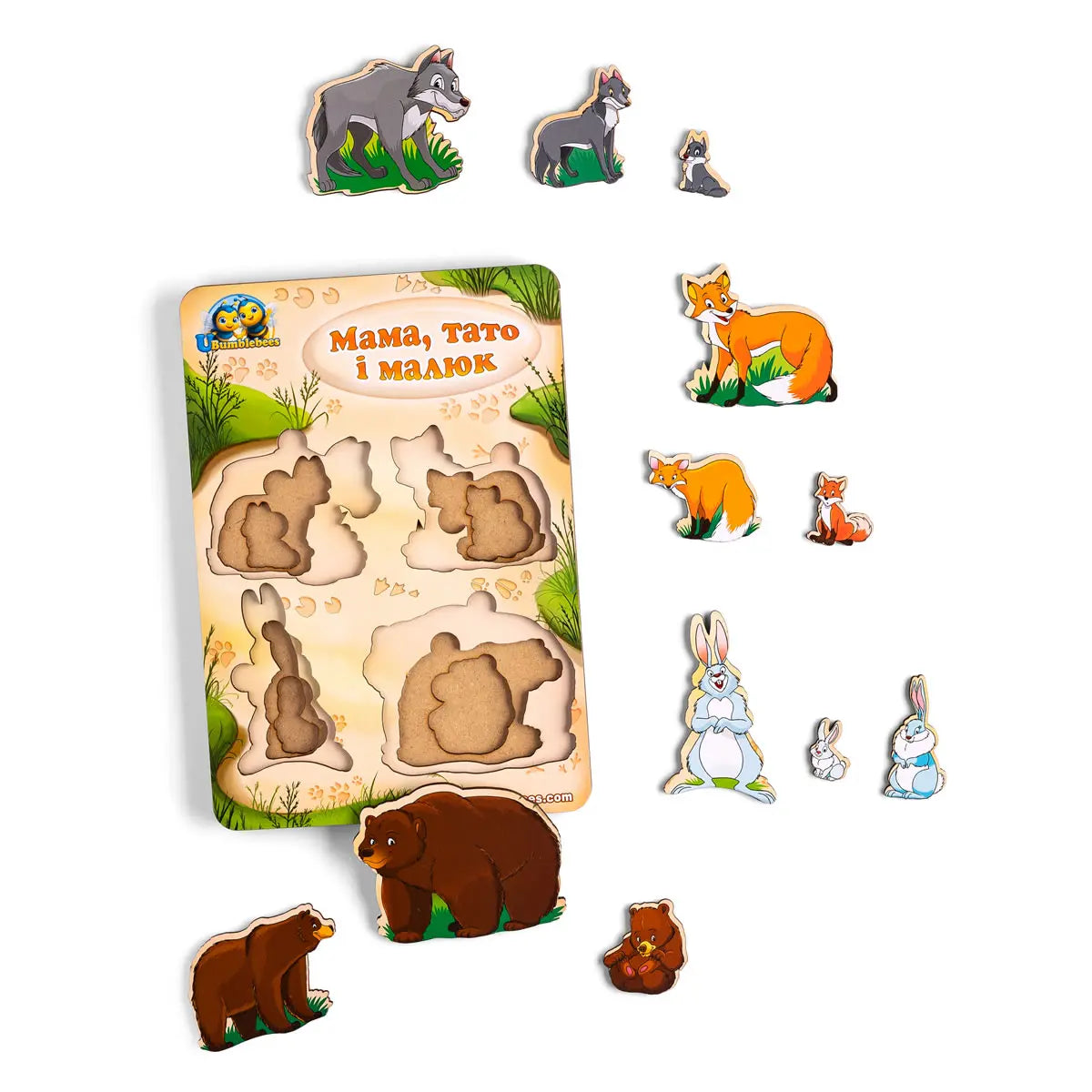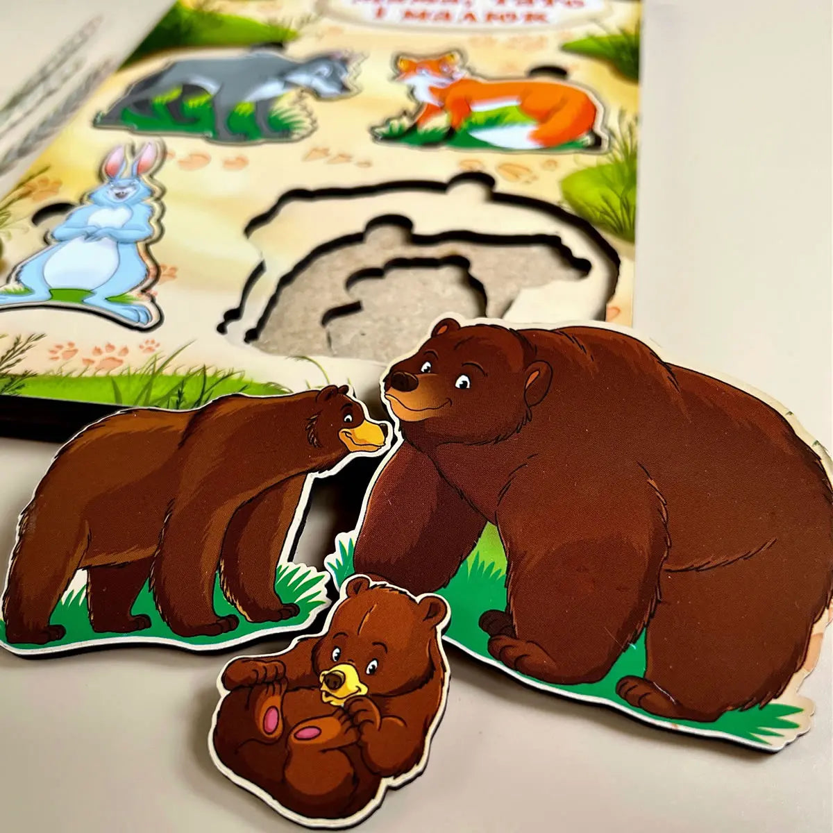 Puidust puslemäng „Metsloomade pere“ aitab õppida suuruseid, pereliikmeid ja loendamist.
