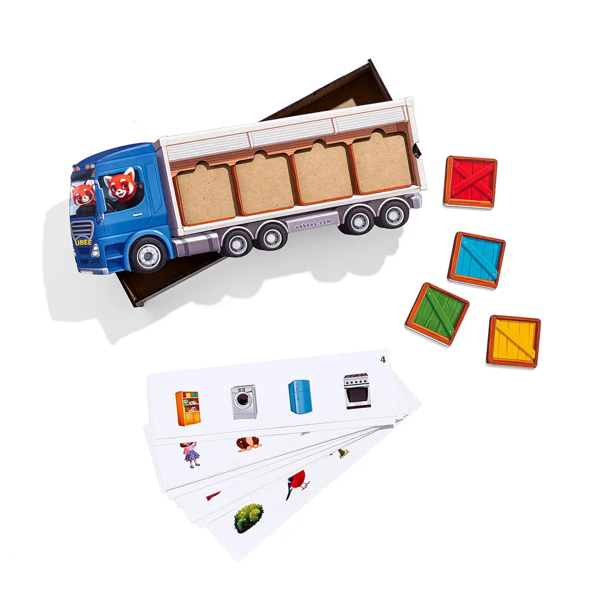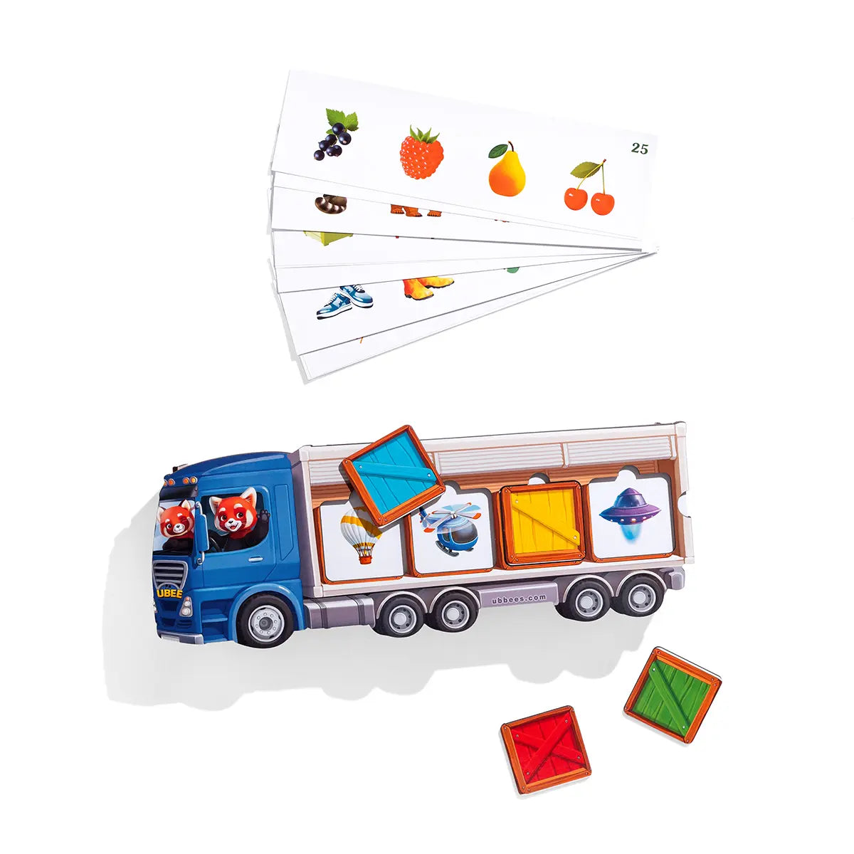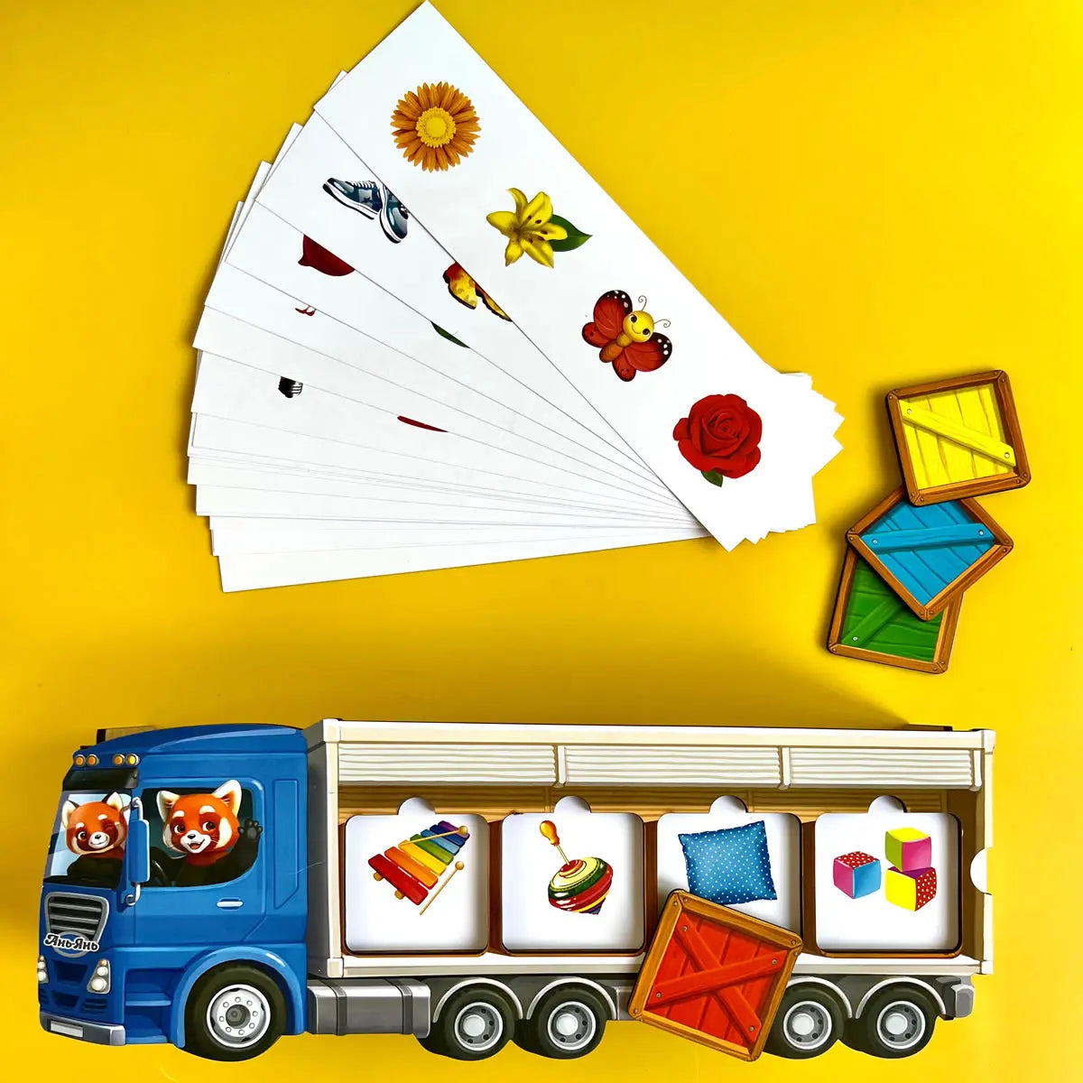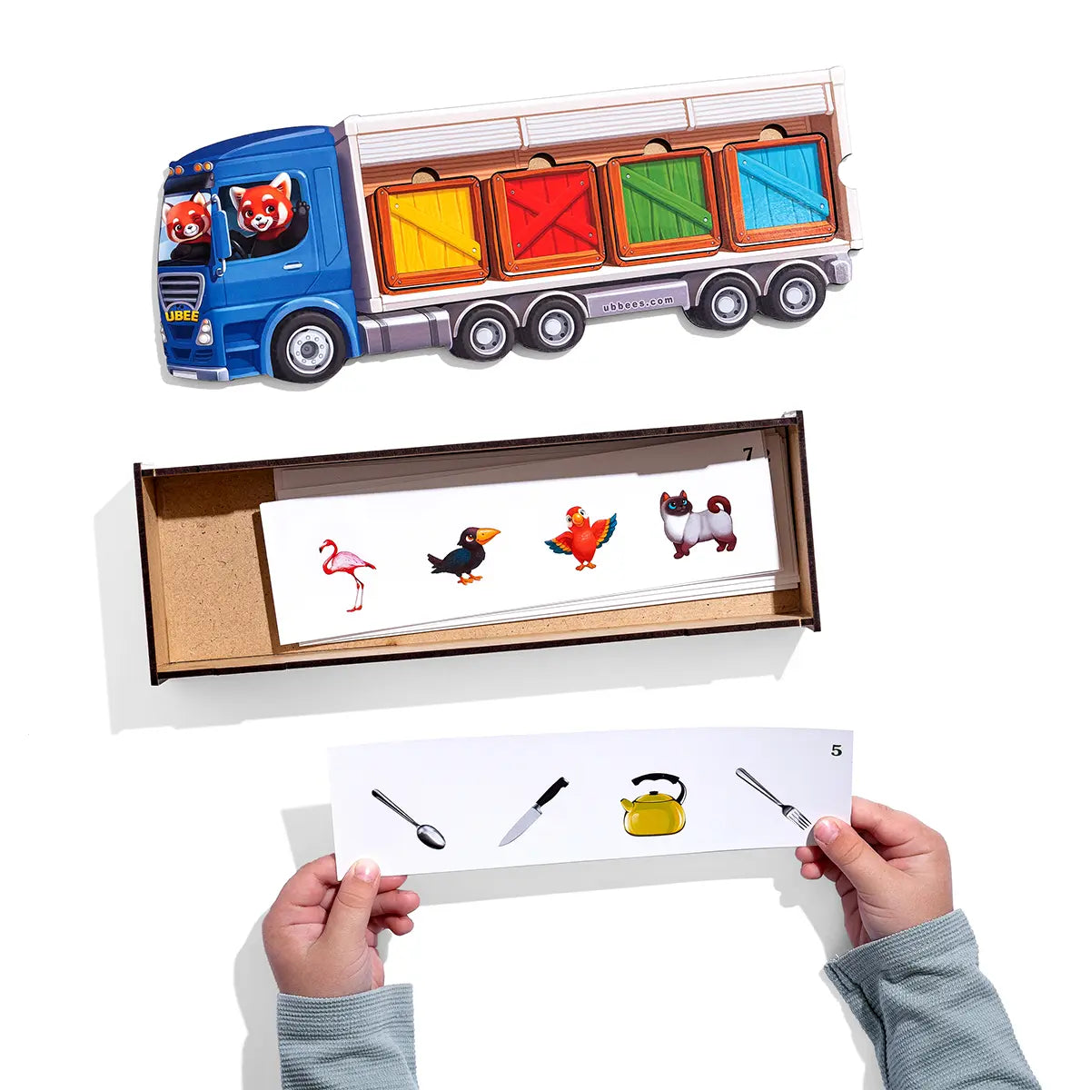 Kes on siin liigne – ja miks? Interaktiivne mäng veoauto ja kaartidega, mis muudab loogikaülesanded põnevaks uurimisretkeks. Laps võrdleb, rühmitab, leiab ühist ja määrab, mis ei sobi – treenides samal ajal mõtlemist, kõnet ja tähelepanu. Ideaalne eelkooliealistele ja algklasside lastele.