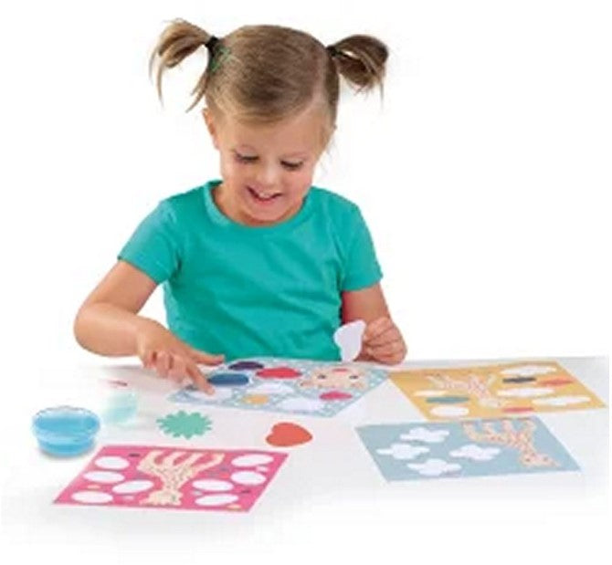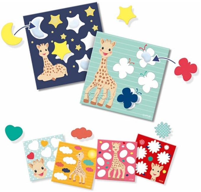 Selles komplektis on kuus Sophie žiraafi pilti, mida tuleb täita värviliste kujunditega. Võluva sõrme-liimiga saad kleepida puuduolevad kujundid õigetele kohtadele. Liim on alguses sinine, nii et näed täpselt, kuhu oled seda pannud.
