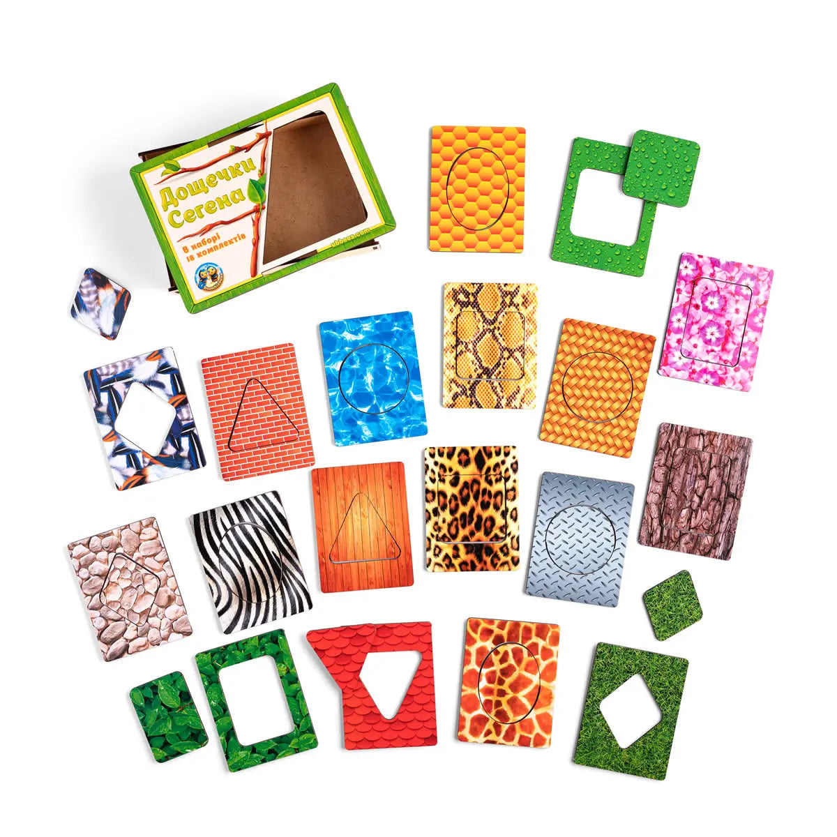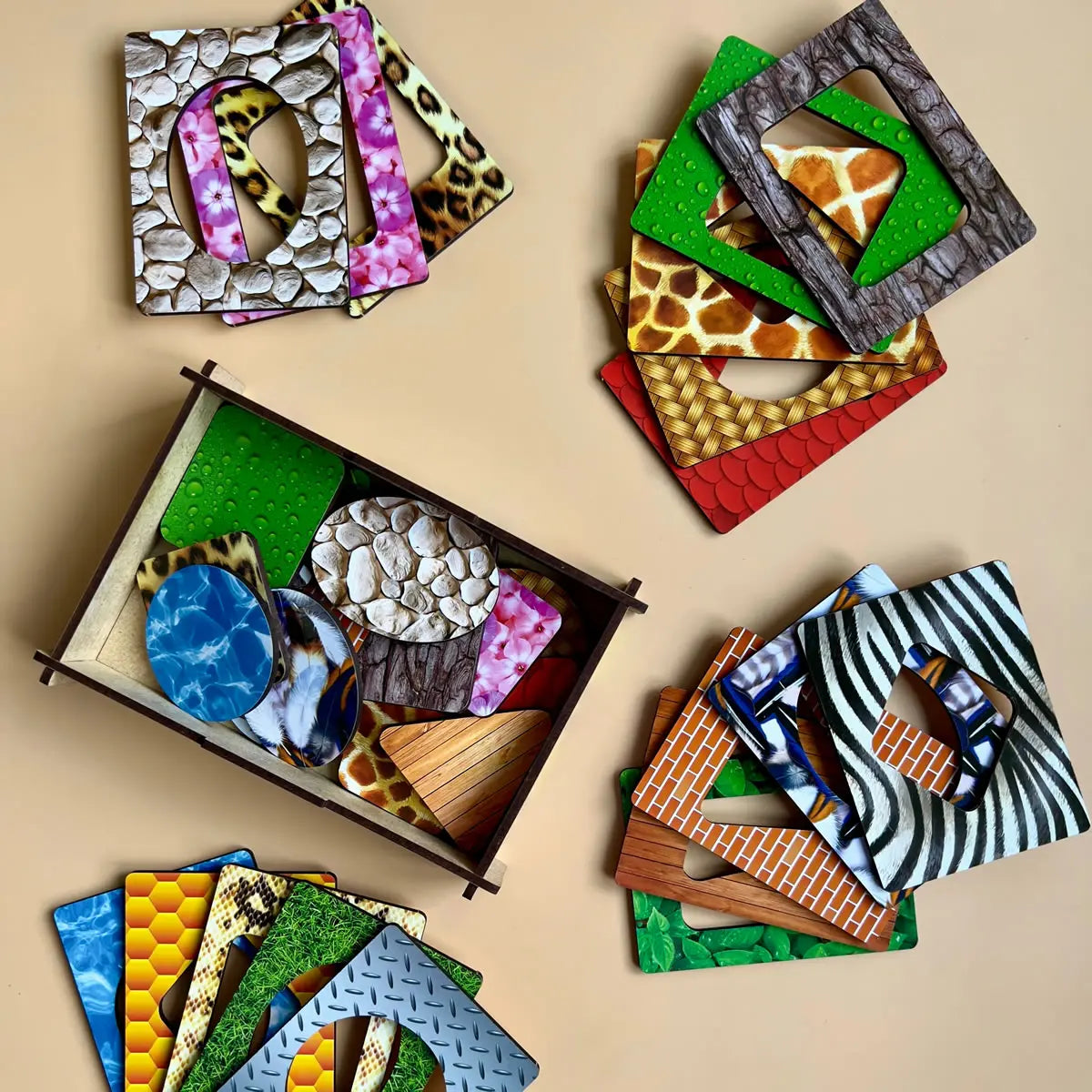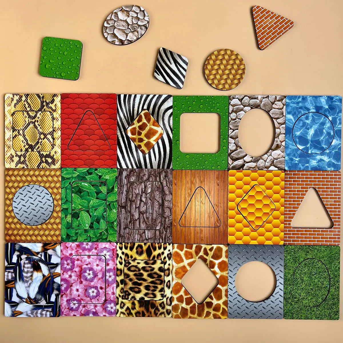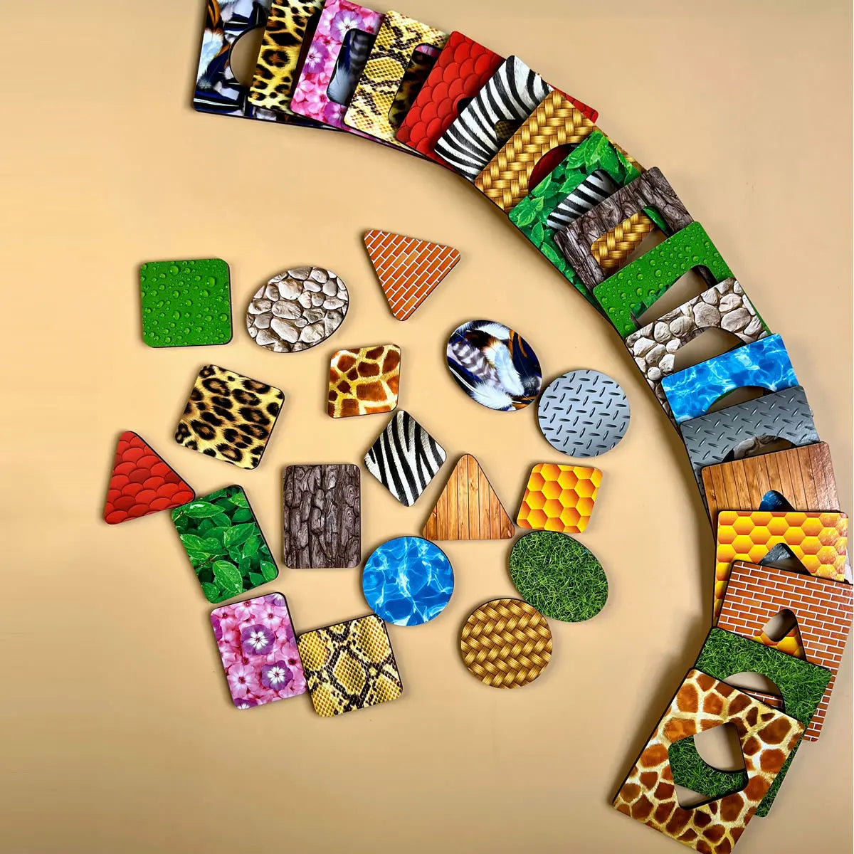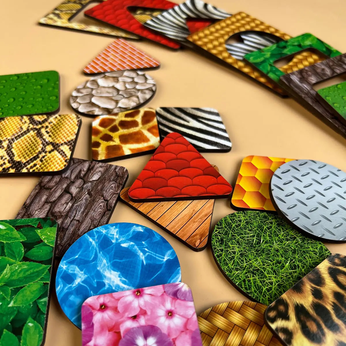 Et leida õige paar, peab laps arvestama nii kuju kui ka mustrit – see treenib keerukat taju ja analüütilist mõtlemist. Ainulaadne kombinatsioon: kuju + visuaalne tekstuur — mugav formaat nii individuaalseks kui ka rühmatööks.