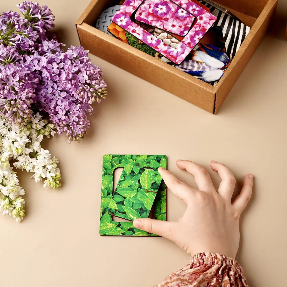Komplektis: 18 raami erksate looduslike tekstuuridega: puukoor, suled, karv, kivi, roomajad, rohi, vesi, loomade nahk; 18 geomeetrilist kujundit (ringid, ruudud, kolmnurgad, rombid jmt); kõik elemendid on valmistatud puidust ja kaetud ohutu trükikattega.