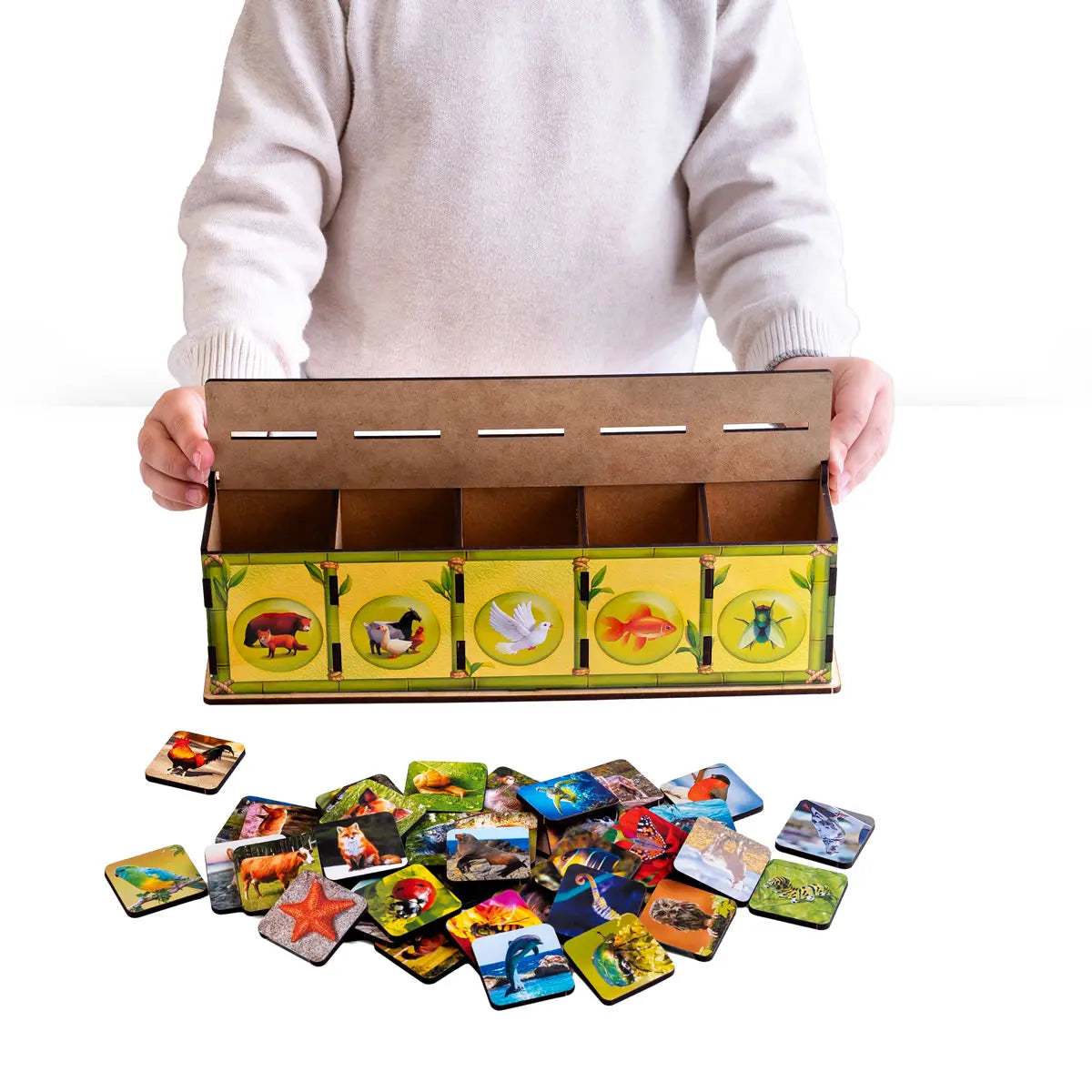 Komplektis: 40 puidust plaati realistlike loomapiltidega, sorteermiskomood 5 temaatilise lahtriga (koduloomad, metsloomad, linnud, putukad, mereelukad), mõõdud: 29 × ,88 × 9 cm.