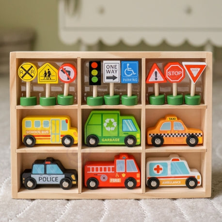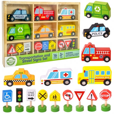 16-osaline komplekt on ideaalne valik väikestele autosõpradele! Komplektis on realistlikud sõidukid, nagu politseiauto, tuletõrjeauto, kiirabi, prügiveoauto, takso ja koolibuss, samuti valik liiklusmärke, mis aitavad õppida ohutusreegleid. Kõik detailid on valmistatud täispuidust – need on ohutud, vastupidavad ja sobivad suurepäraselt lastele alates 3. eluaastast. Mäng on ühtaegu lõbus ja hariv, pakkudes võimalust rollimängudeks ja liiklusreeglite õppimiseks.