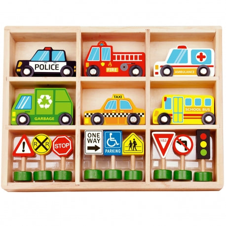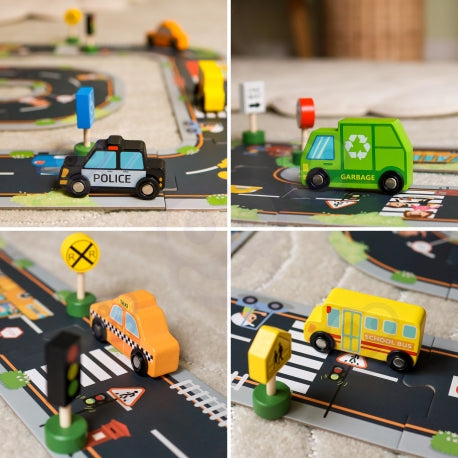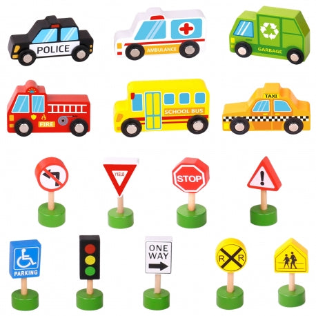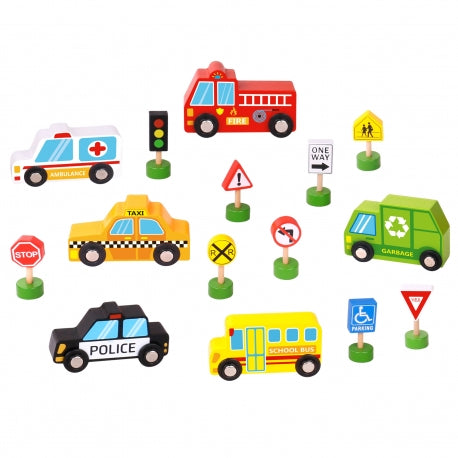 Komplekt sisaldab: kiirabi, tuletõrjeauto, takso, koolibuss, politseiauto, prügiveoauto, valgusfoorid, 8 liiklusmärki.