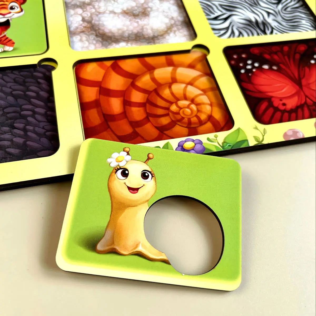 Puidust loomade tekstuuride sorteerimismäng "Kelle muster?"