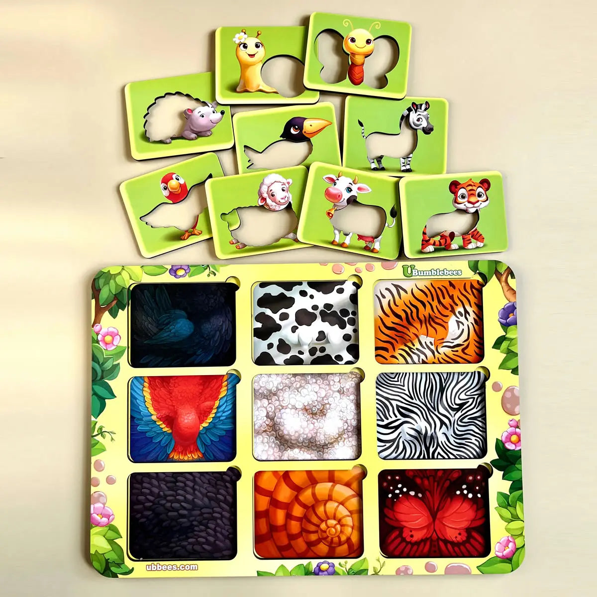 Ülesanne on määrata, milline üheksa tekstuuri (karv, suled, soomused, laigud jpm) kuulub konkreetsele loomale, ning sobitada iga kaart õigesse mustrisse.