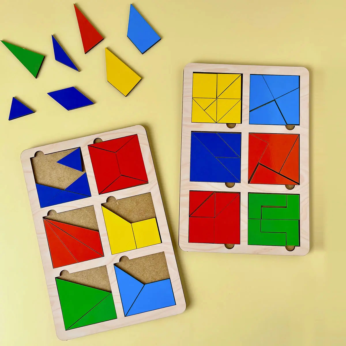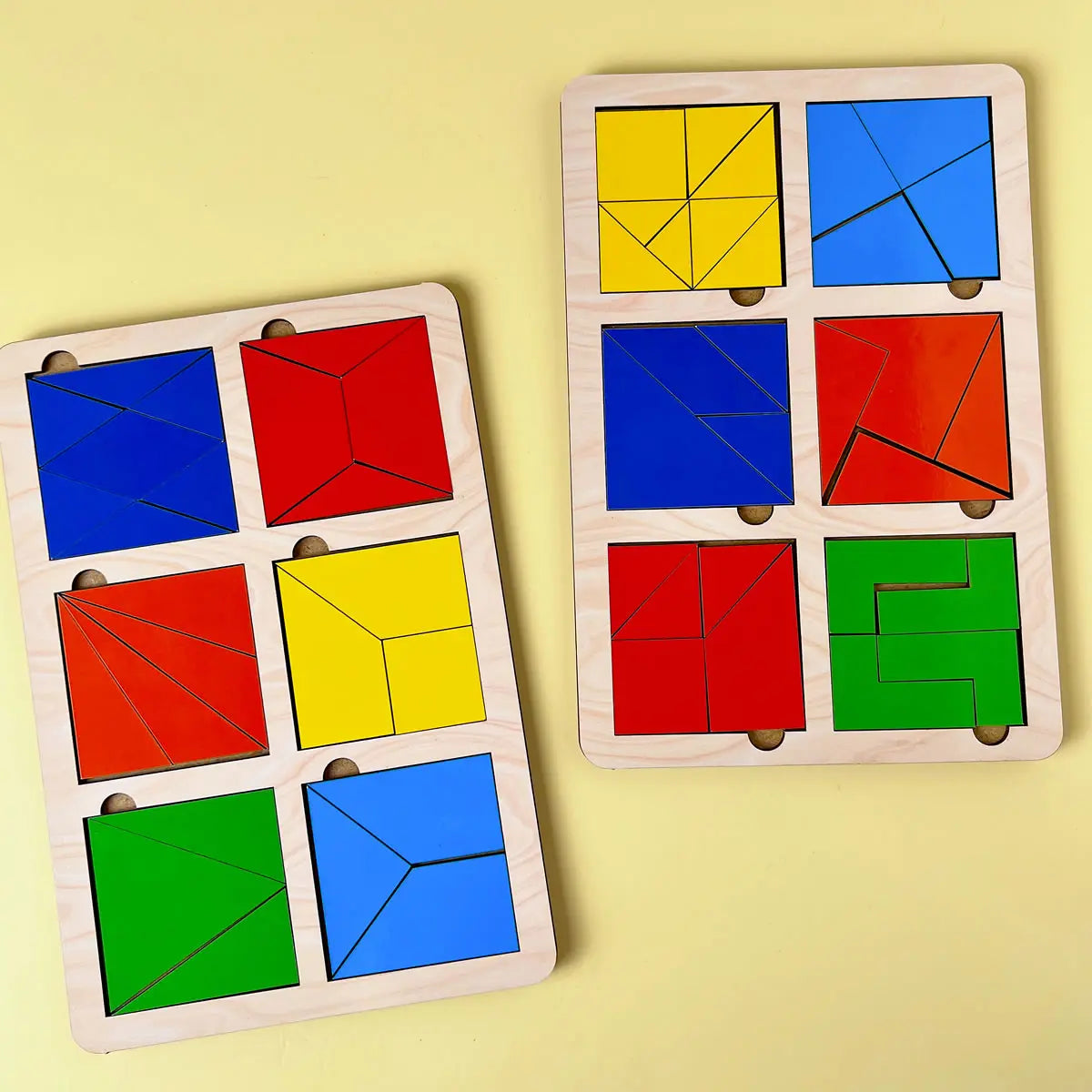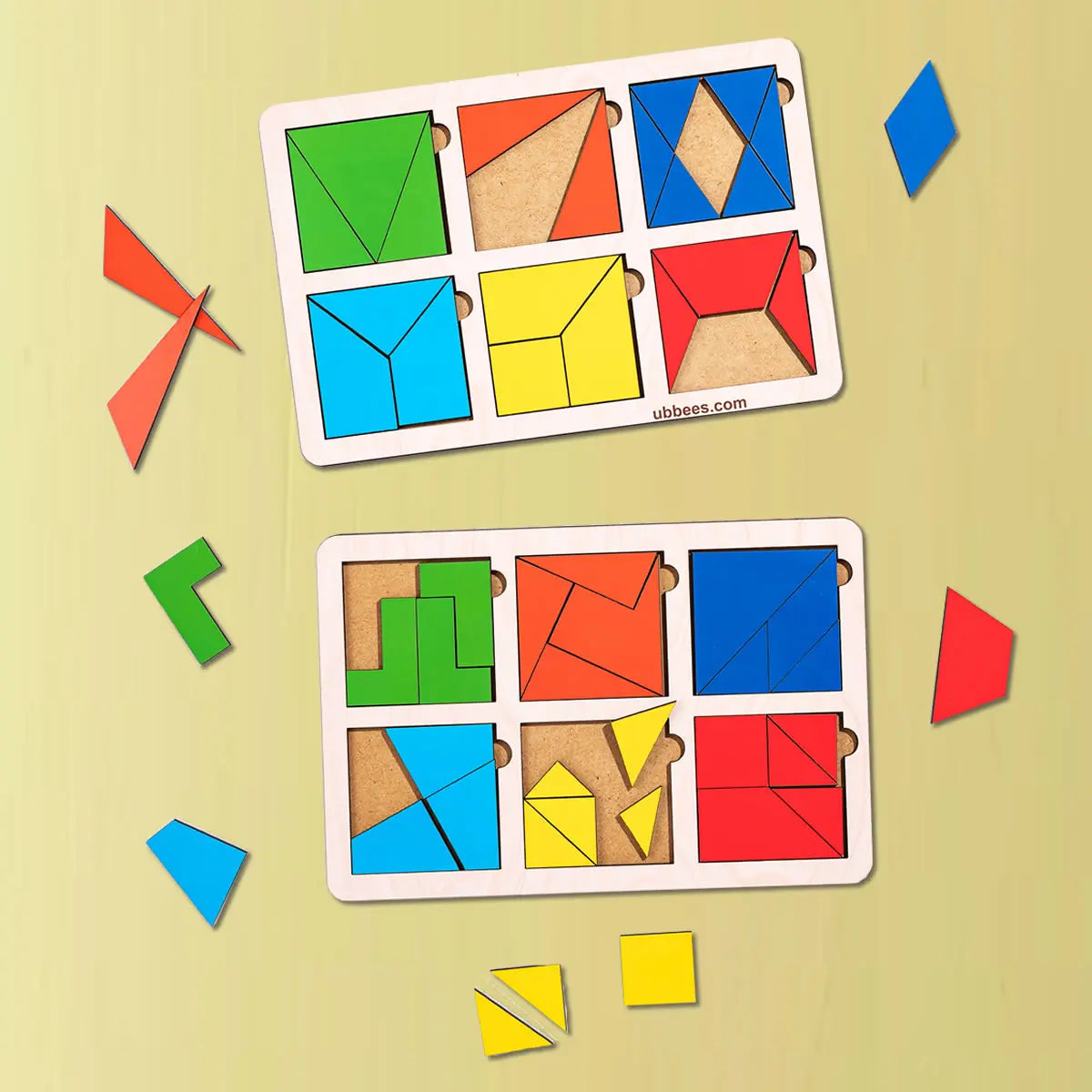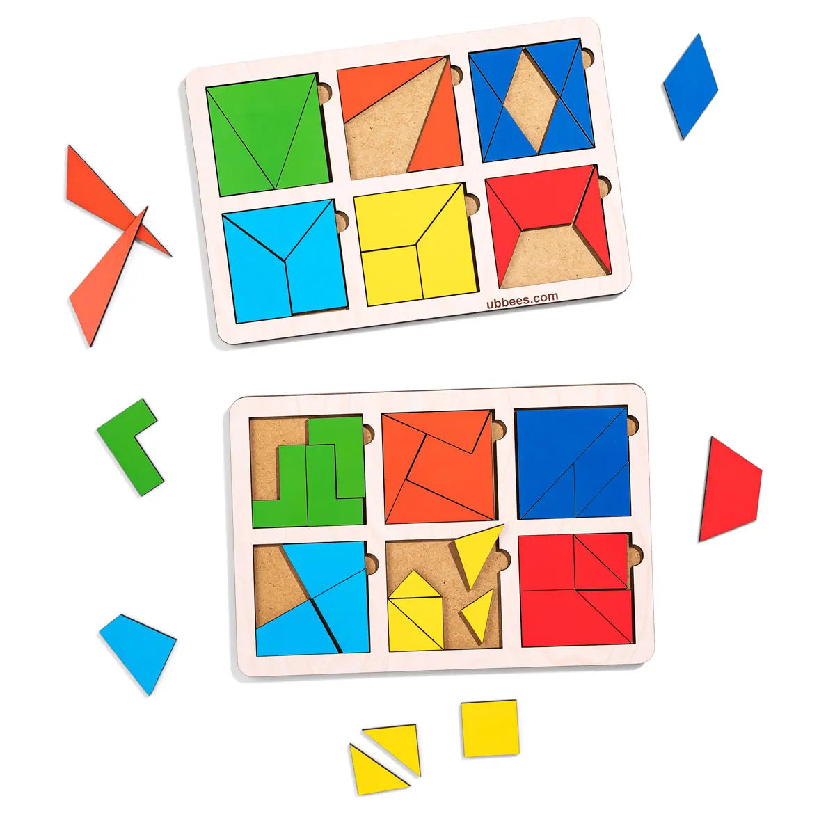 Komplektis: 2 puidust alust süvenditega, 12 ruutu, igaüks jaotatud 2–8 tükiks, kokku 30 puidust elementi,