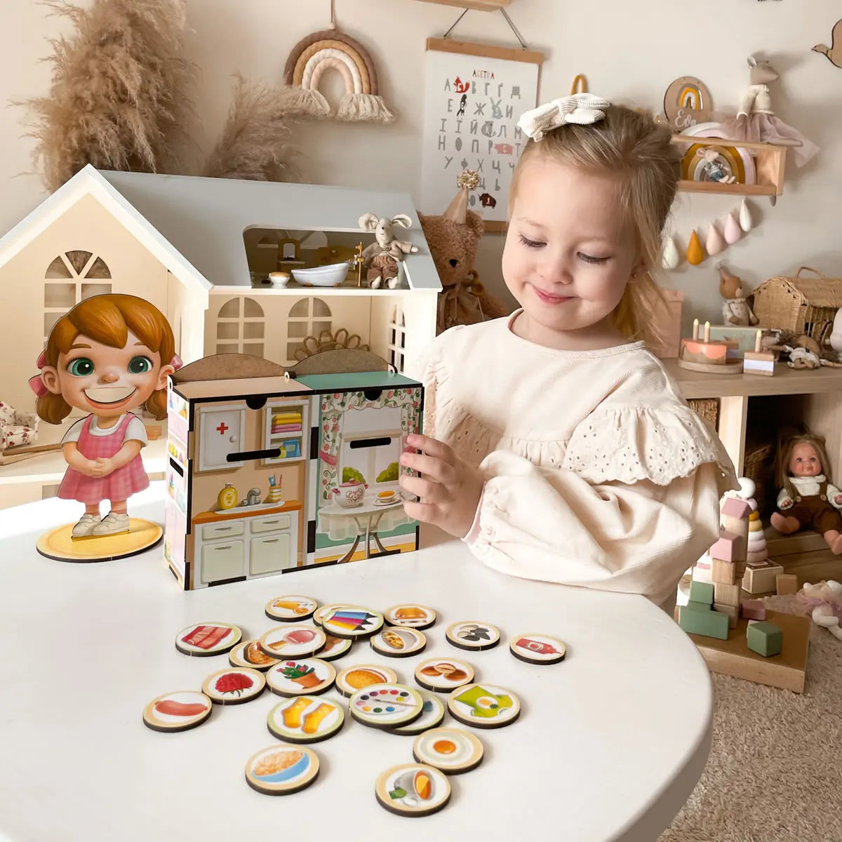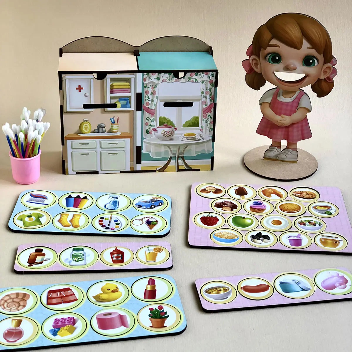 Komplektis on 40 ümmargust žetooni esemete piltidega: toit, riided, mänguasjad ja kodutarbed. Lapse ülesanne on õigesti paigutada need kategooriatesse. Lisaks saab aidata nukku Yaset kodutöödes!