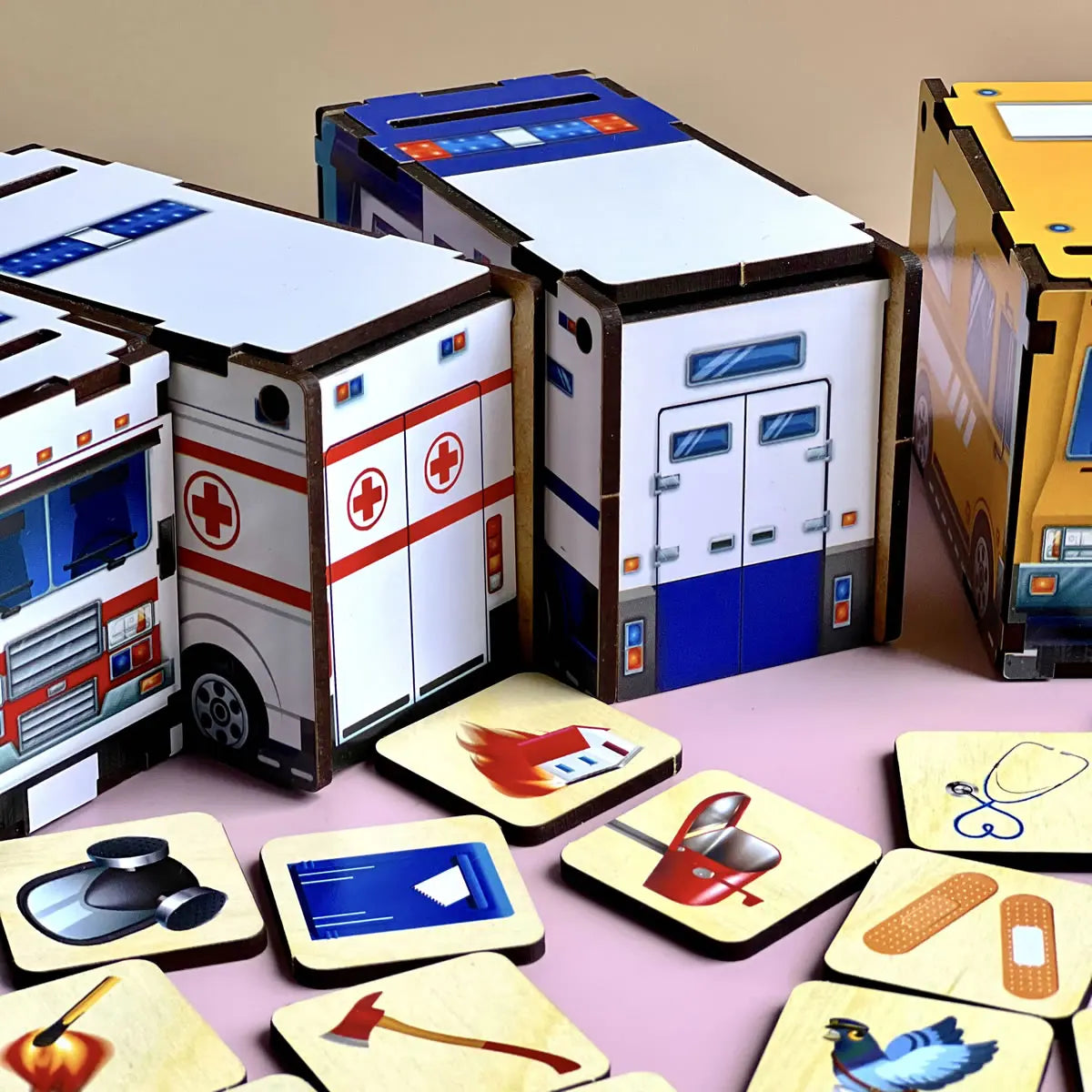 Komplektis: 4 puidust karpi teenindussõidukite kujul — tuletõrjeauto, kiirabi, postiauto, politseiauto, 40 temaatilist plaati esemete piltidega, 4 aluskaarti piltidega, karbi mõõtmed: 23 x 12,5×12 cm.