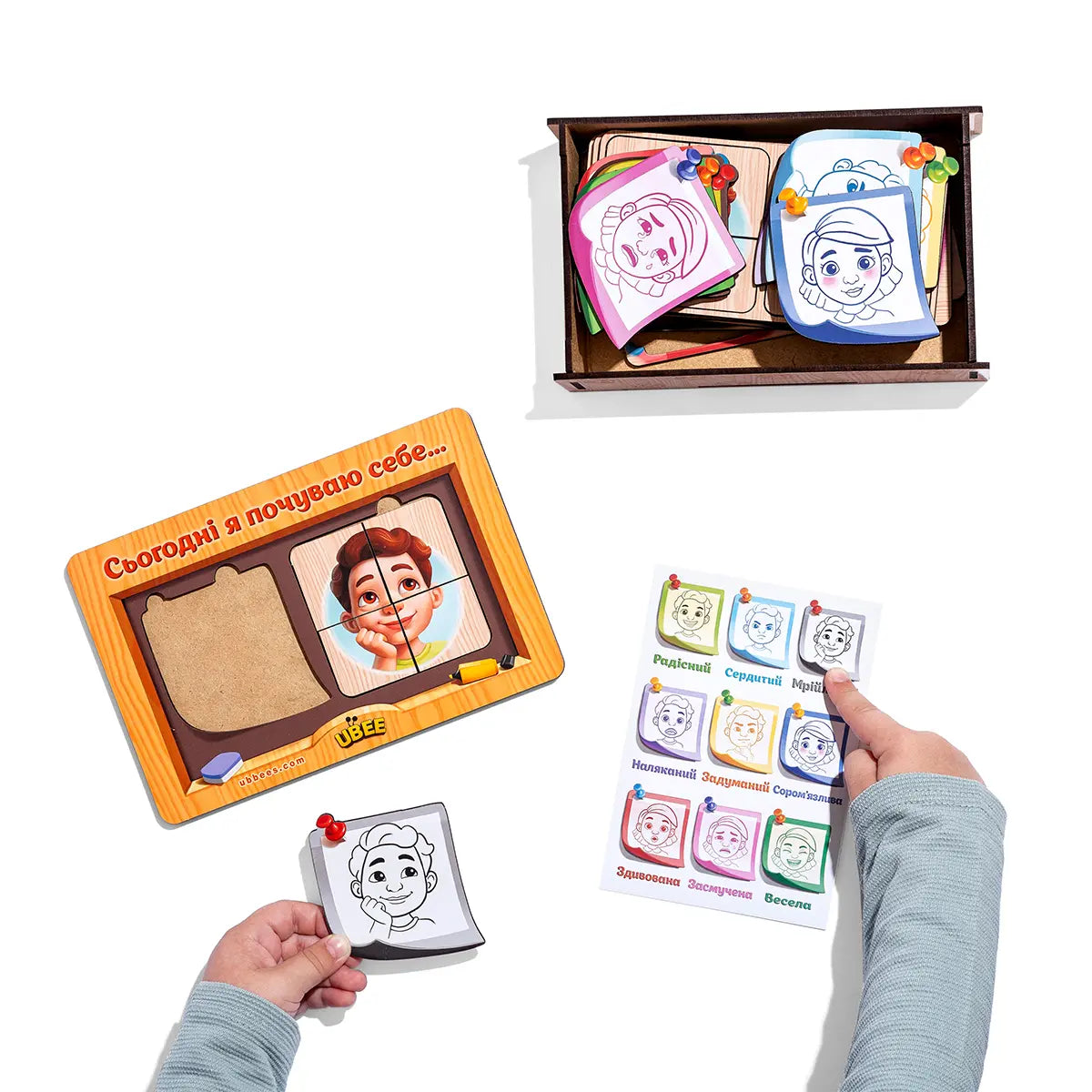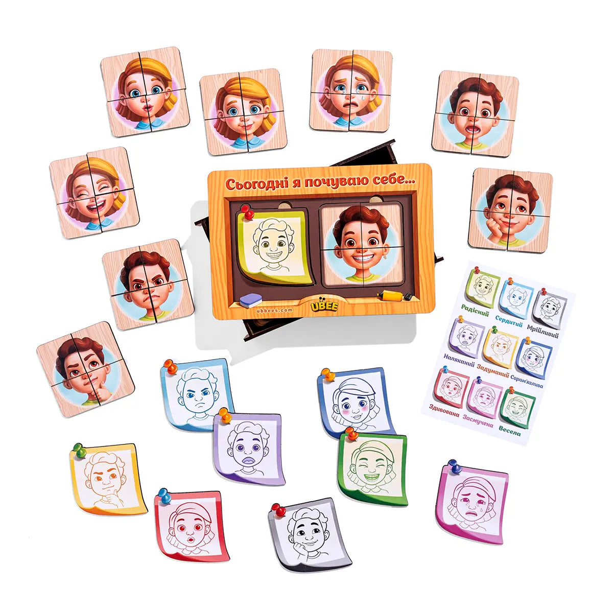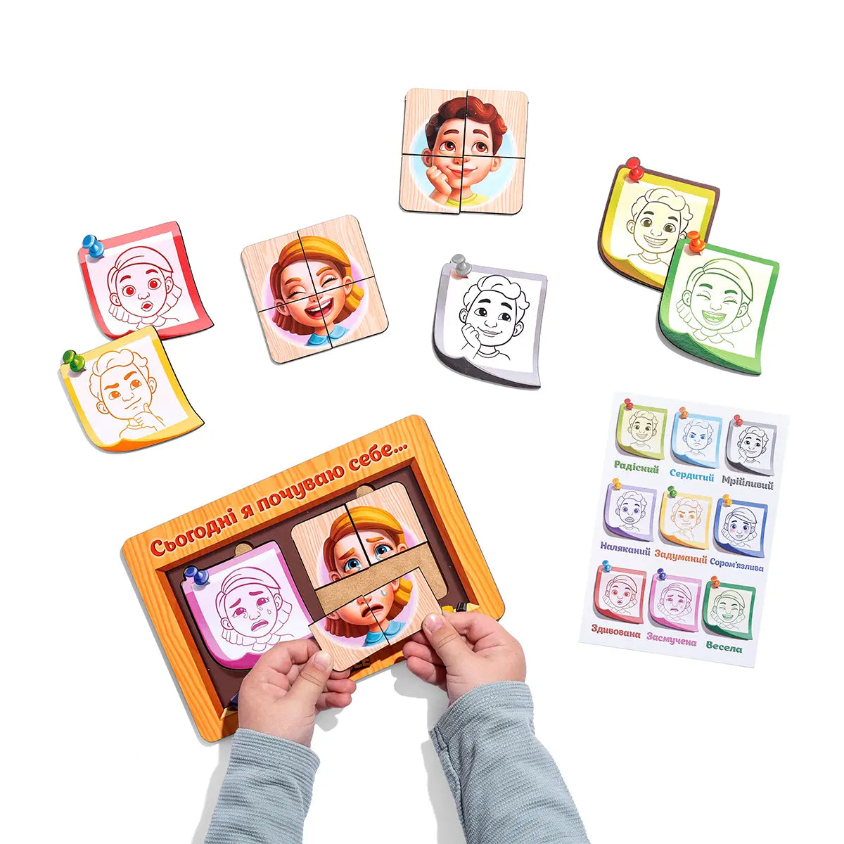 В наборе: 36 деревянных деталей для сборки, 9 лиц с разными эмоциями, 9 карточек с графическим изображением эмоций (радость, грусть, удивление и др.), основа с фразой «Сегодня я чувствую себя...»