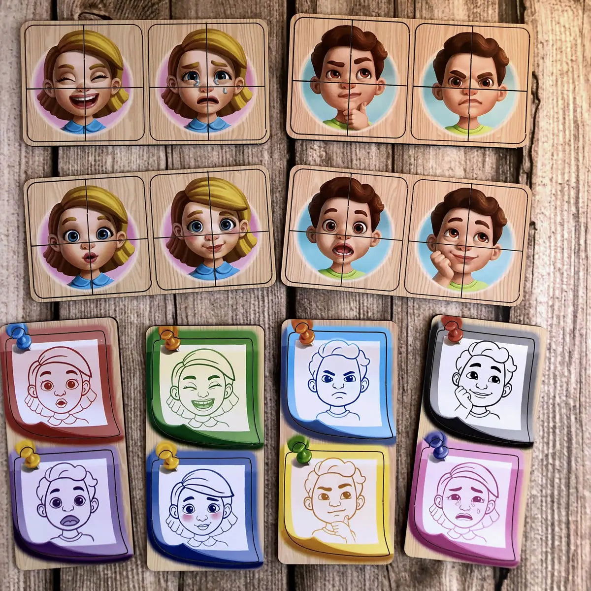 Это не просто пазл — это игра, которая учит понимать и выражать свои чувства. Ребёнок собирает лица из элементов, находит соответствие между изображением и настроением, проговаривает, как он себя чувствует. Педагогическая формула проста: назвал — осознал — прожил. А игровая форма делает этот процесс лёгким и увлекательным.