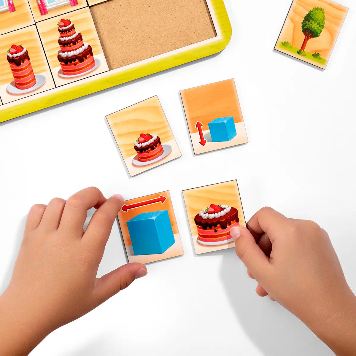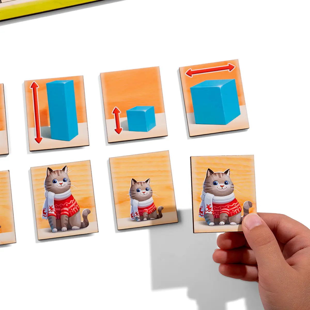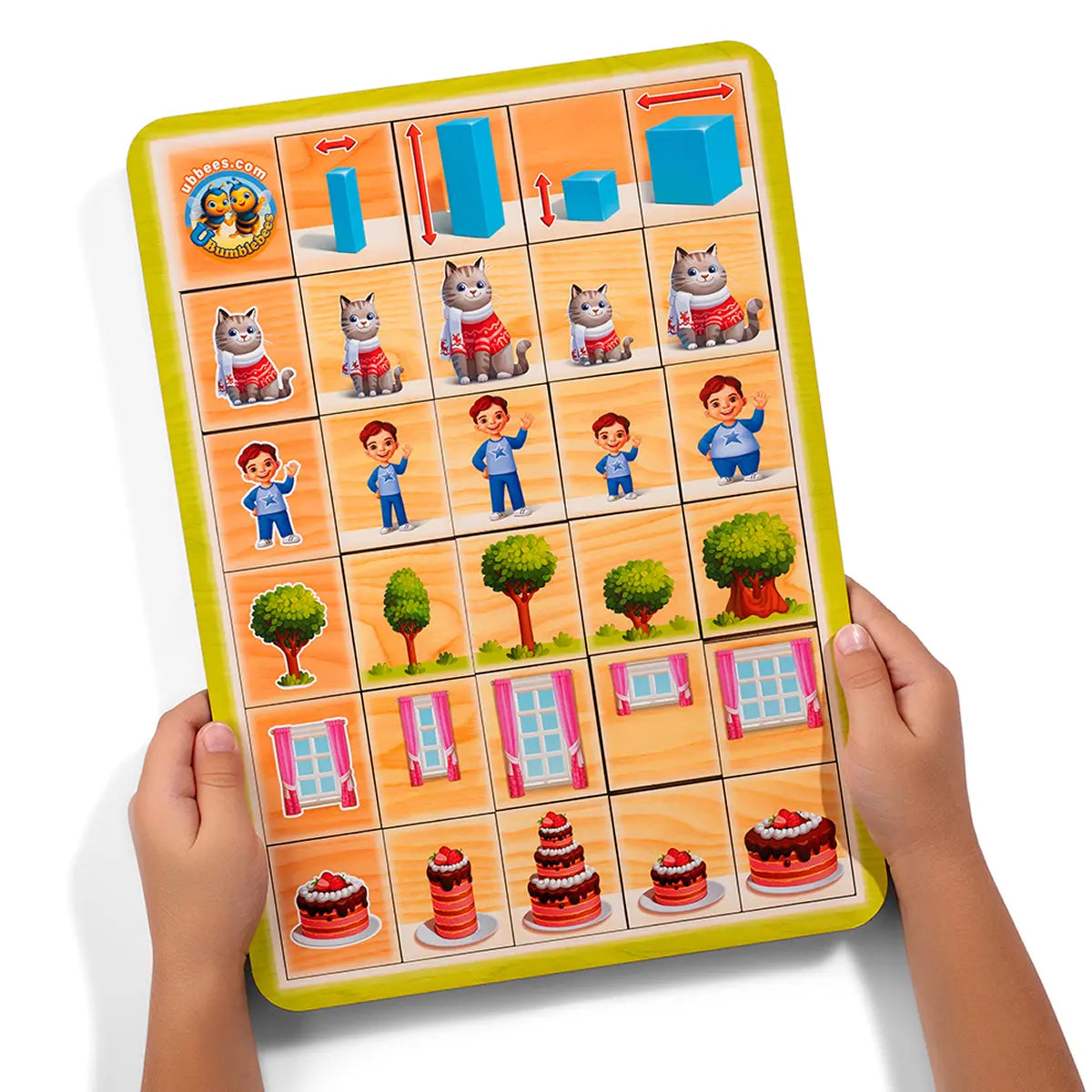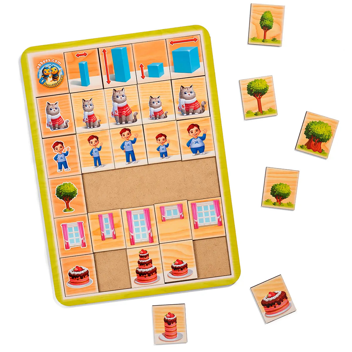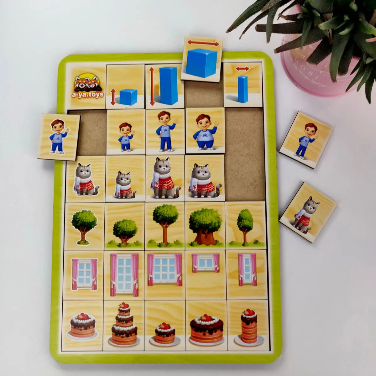 Перед ребёнком — необычный сортер с визуальной логикой. По вертикали — изображения персонажей, животных, предметов. По горизонтали — характеристики: высокий, низкий, широкий, узкий. Задача — подобрать плитку и разместить её в нужной ячейке, сопоставив объект с его признаком. Это развивает мышление, внимание и навык анализа.