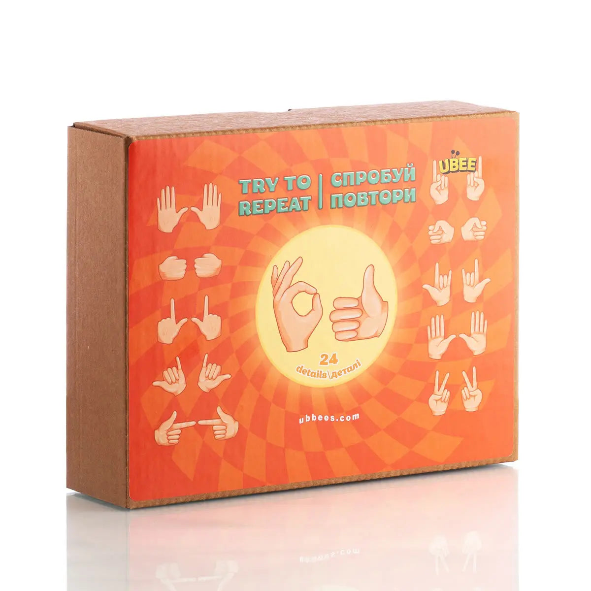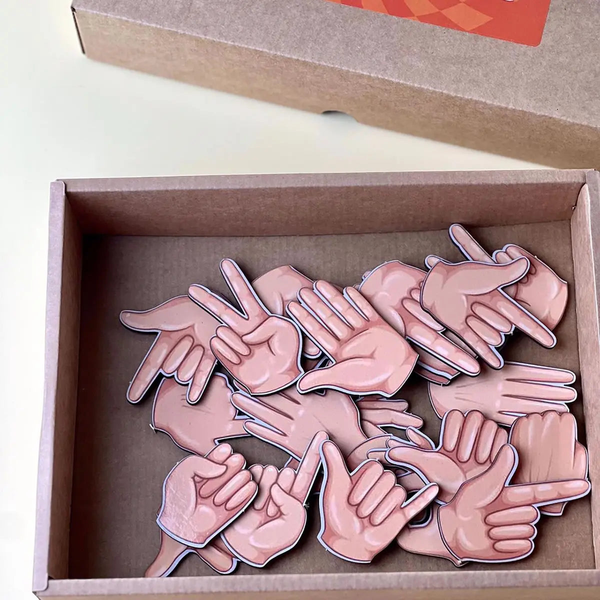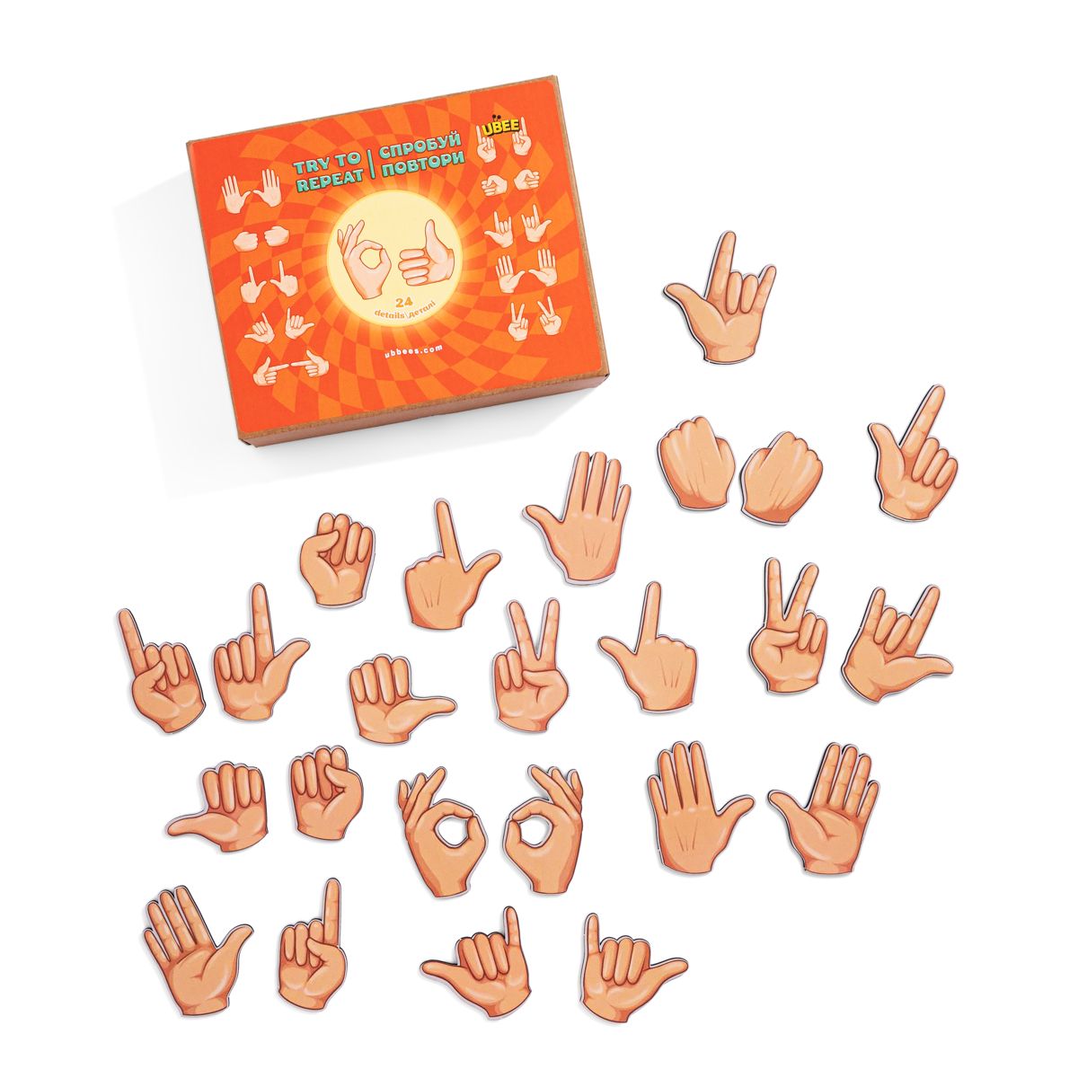 В наборе: 24 деревянные карточки-ладошки с разными жестами, компактная коробка для хранения,